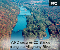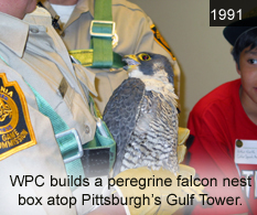 1990 WPC protected 2,731 acres in the Laurel Highlands, including three separate parcels totaling 1,036 acres in the Quebec Run Wild Area in southern 1991 Fallingwater voted “Best All-time Work of American Architecture” by the American Institute of Architects. WPC acquired USX property in Erie County to create a new 3,131-acre state game lands that will be named the David M. Roderick Wildlife Reserve in honor of the Western Pennsylvania Conservancy staff and volunteers build a peregrine falcon nesting box atop Pittsburgh’s Gulf Tower. (see photo)