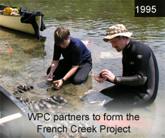 Conservation in the French Creek Watershed French Creek is arguably one of the richest streams for aquatic life in Pennsylvania. Certain species of endangered freshwater mussels still exist here that are found few other places in the United States. And since the stream provides a healthy habitat for the species, mussels repay the favor by filtering the water and making it even cleaner. This nationally significant waterway begins in Chautauqua County, western New York, and flows for 117 miles through the northwestern Pennsylvania counties of Erie, Crawford, Mercer and Venango until it empties into the Allegheny River at Franklin, Pennsylvania. In 1995, WPC joined with the Pennsylvania Environmental Council and Allegheny College to form the French Creek Project. After a decade of cooperation, the project won national recognition for raising public awareness of French Creek and for engaging watershed communities in preserving the creek. Since then, WPC has dedicated staff and energy to both raise awareness and protect this important waterway. These include: